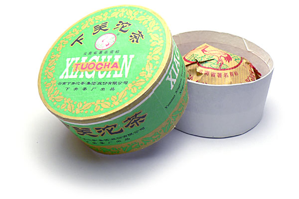 | 「雲南沱茶」は、プーアール茶を小さなお碗の形に固めた固形茶の一種。プーアール茶には様々な種類がありますが、中国では、茶葉バラバラになった散茶タイプよりも、保存や運搬に便利な固形茶タイプの方がむしろ多いくらいです。この「雲南沱茶」は、雲南省の下関シャーグアンで生産された、「下関沱茶」とも呼ばれる上級品。上品な味と香りが特徴です。 |