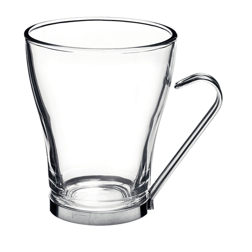 | スチールの「取っ手」部分は、グラスの底の部分で接しています。熱い飲み物を入れても、「取っ手」に熱が伝わることはなく、スマートです。 |